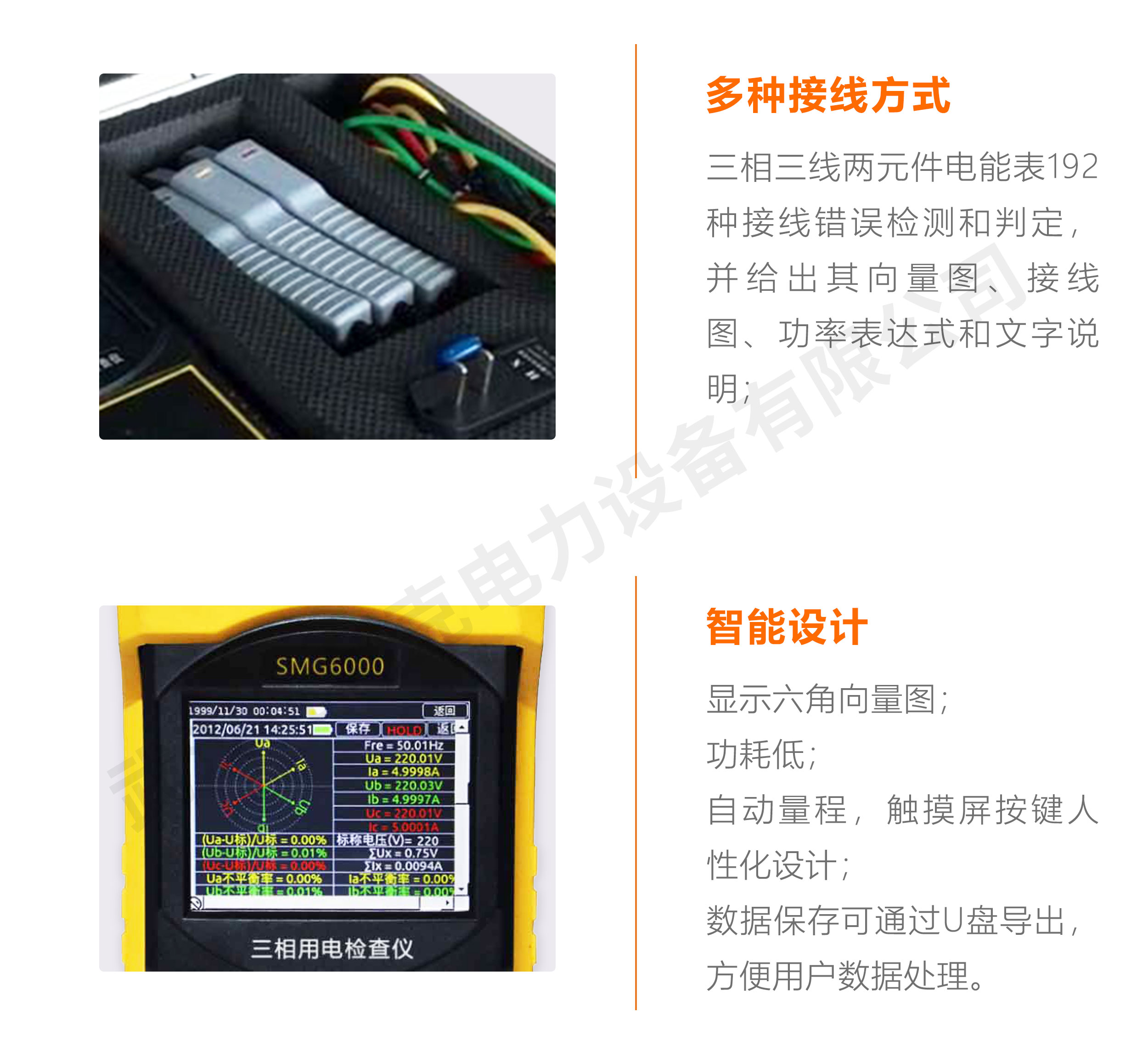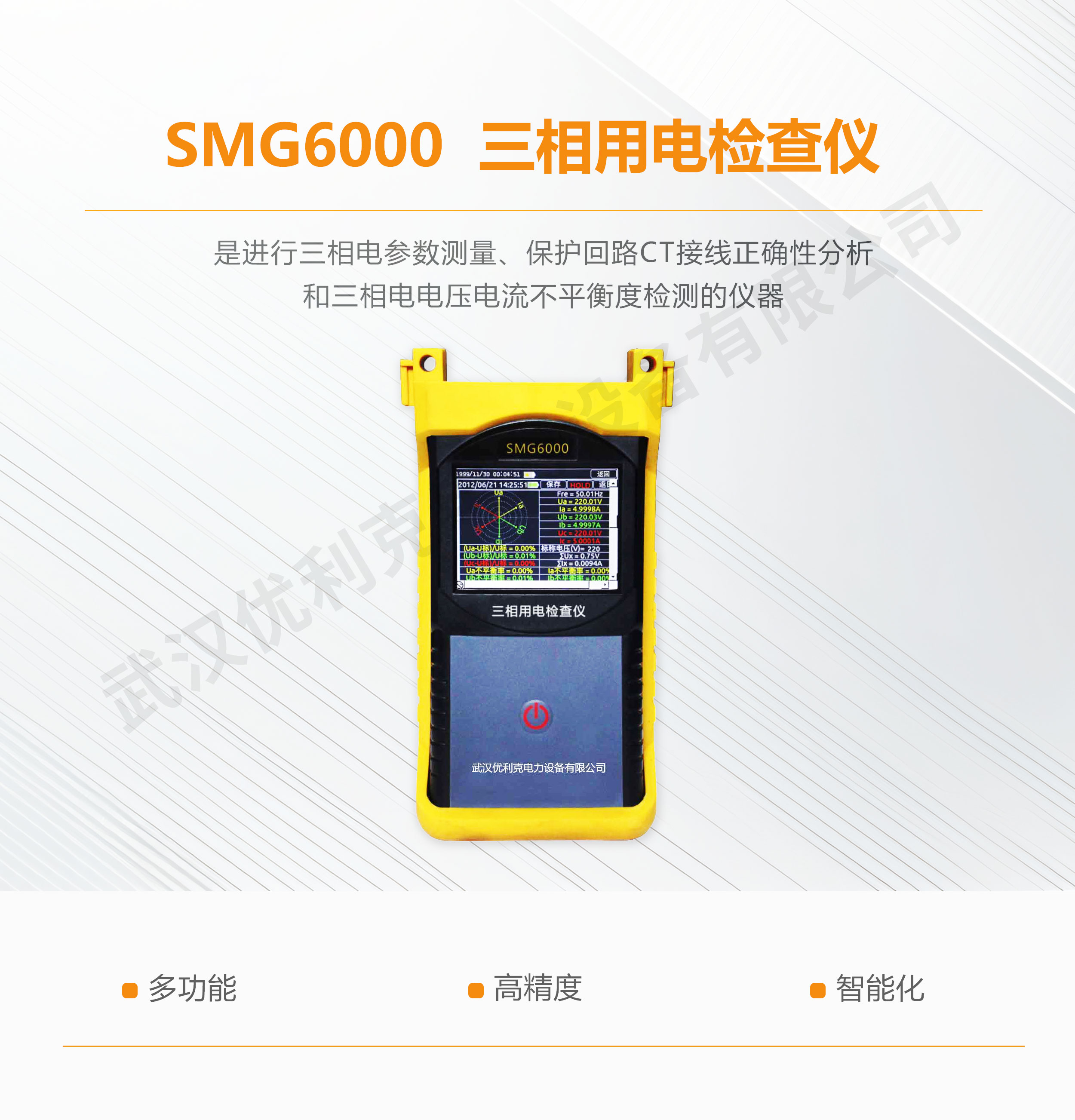 SMG6000三相用電檢查儀是進行三相電參數(shù)測量、保護回路CT接線正確性分析和三相電電壓電流不平衡度檢測的儀器,可以完成三相的電壓、電流、相角、頻率、功率、功率因數(shù)等電參數(shù)的高精度測量,更為獨特的是,能分析CT接線的正確性檢查電力線用電平衡情況。并具有電能計算功能。