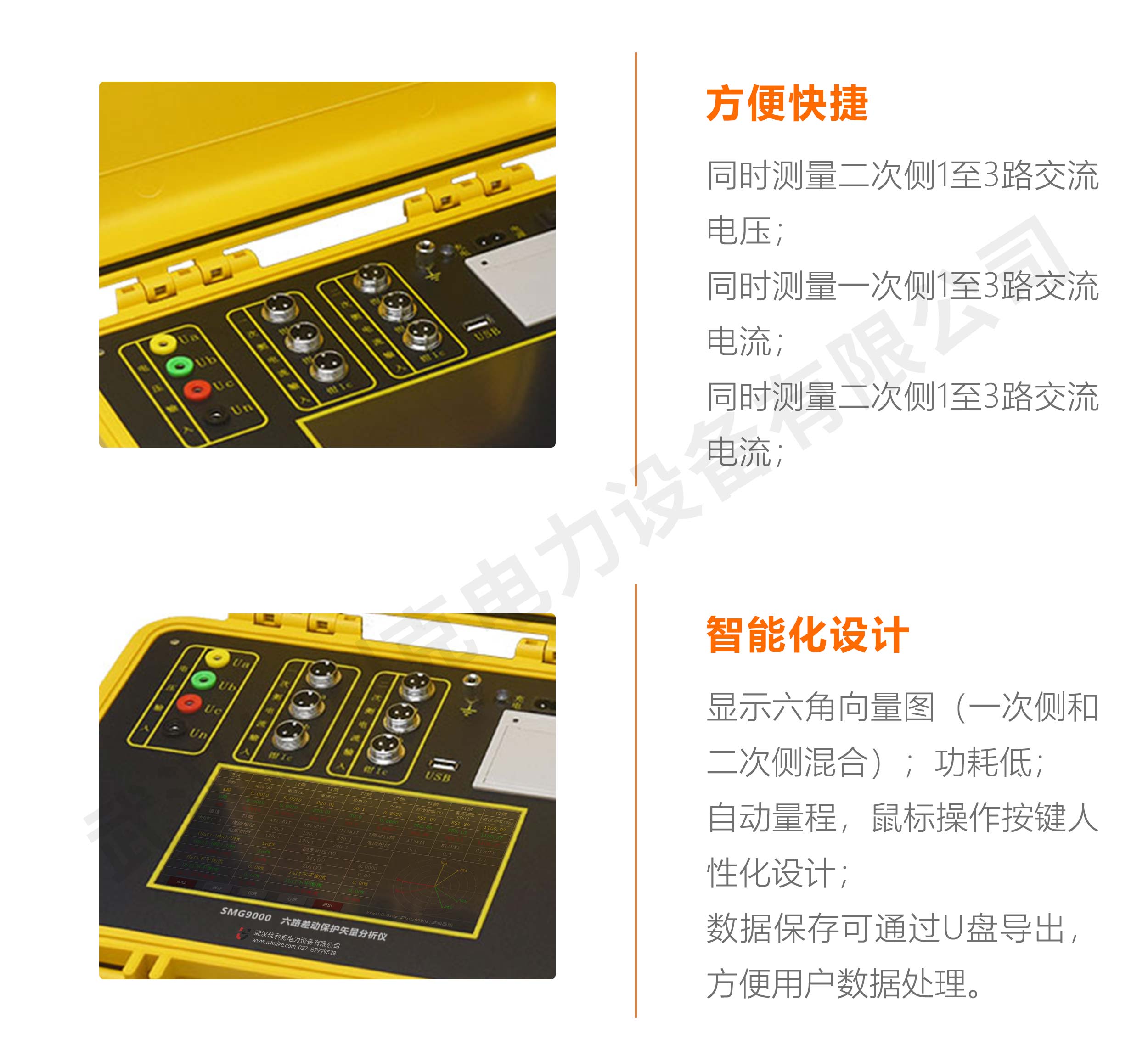 SMG9000六路差動(dòng)保護(hù)矢量?jī)x是一種可以同時(shí)測(cè)量一次側(cè)電流、二次側(cè)電流和二次側(cè)電壓既而做分析得出報(bào)告的儀器,儀器精確測(cè)量一次側(cè)電流、二次側(cè)電流和二次側(cè)電壓可以分析三相不平衡度和六角向量圖等,并可以輸出Word和Excel文件,無(wú)需上位機(jī)軟件,方便用戶后期處理報(bào)告。
